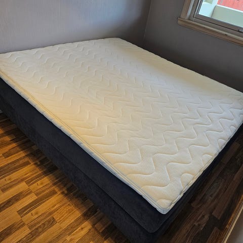 90x200cm seng, gis bort mot henting. Beina kan skrus av. Veldig god å sove i. Rammemadrass.