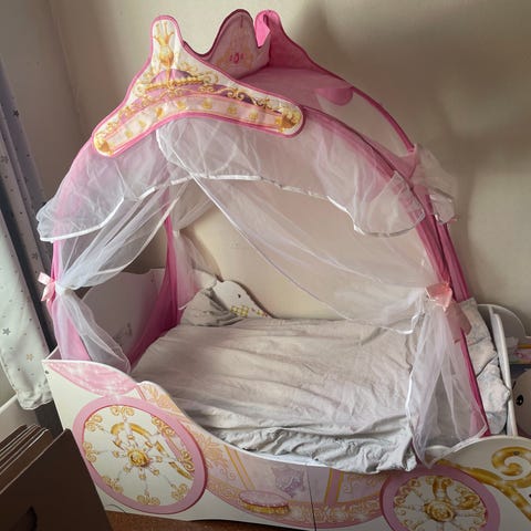Rosa vokseseng fra ikea. Kan dras helt ut til 200cm. Sengen har endel klistremerker og merker som ikke er forsøkt vasket bort.