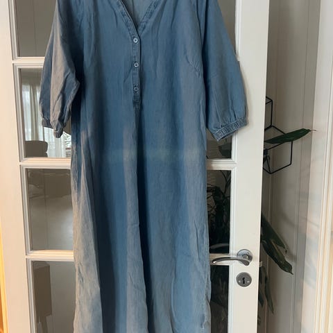 Cellbes hverdagskjole i denim for dame i størrelse 44. Kjolen er blå og laget i denimstoff, med løs passform og trekvart lange ermer med rynkedetaljer ved mansjettene. Utringningen er V-formet med broderte sømmer rundt halsen. Passer som en komfortabel hverdagskjole i et lett denimstoff.Ikke brukt.bare prøvd på. Ble for trang over min byste