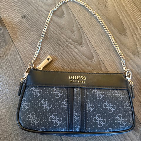 Sort Guess clutch veske for dame i svart kunstlær. Vesken har håndleddsrem og metallfarget Guess-logo på forsiden. Passer til oppbevaring av mindre eiendeler som mobil, nøkler og lommebok.