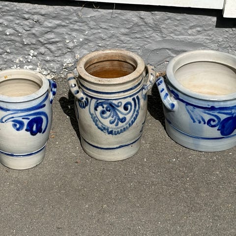 Krukkene er i ulik størrelse. Den største har en del slitasje på glasuren.