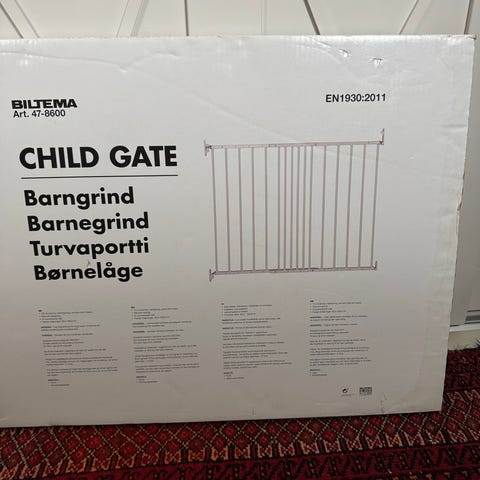 Sikkerhetsgrind i hvitlakkert metall. Grind beregnet for sikring av åpninger som dører eller trapper i hjemmet. Åpningen består av vertikale spiler og mekanisme for låsing/åpning øverst. Leveres med sideforlengere som gjør det mulig å tilpasse bredden til ulike åpninger. Egnet til bruk i hjem med små barn for å avgrense områder etter behov.