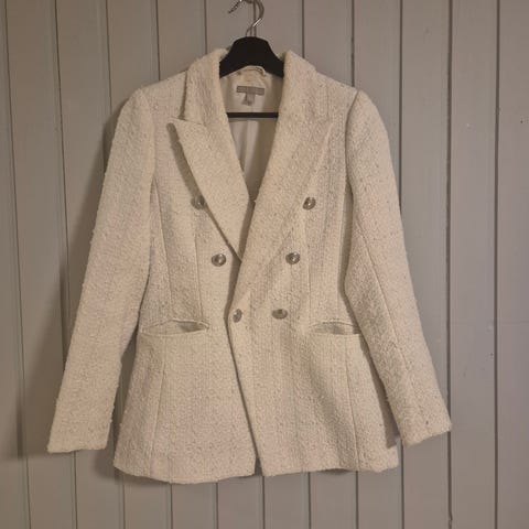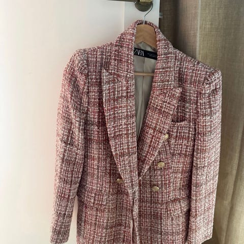 Zara blazer i tweed for dame i størrelse M. Blazeren er rosa med strukturert tweedmønster og har dobbeltspent lukking med knapper foran. Klassisk krage og jakkeslag, samt lommer med klaff foran. Fôret innside for mer komfort. Passer til bruk både til hverdags og mer formelle anledninger.