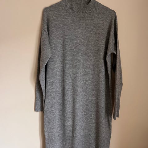 Soaked in Luxury Marella Knit Dress hverdagskjole for dame i størrelse L. Kjolen er i en melert olivengrønn farge og er strikket i ullblanding, 50% ull. Høy hals/polo, lange ermer og ribbestrikkede mansjetter. Mål fra armhule og ned er 70 cm, og fra skulder og ned er den 90 cm. - kjole til meg på 155 cm , da går den ca 10 cm under knærne. - Fin olivengrønn farge i en ullblanding 50% ull og 50% polyester . Kun brukt et par ganger.