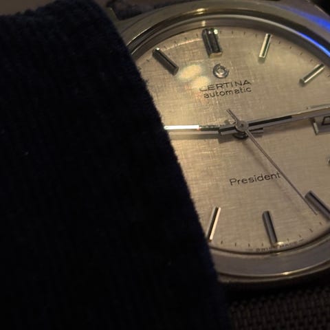 Certina Blue Ribbon herreklokke med automatisk urverk og analog visning fra 1960 tallet. Klokken har rund strøken sølvfarget urskive med enkle indeksmarkeringer og datovisning klokken tre. Urkassen er i metall med klassisk design. Modellen leveres med en grønn tekstilrem. Passer som hverdagsklokke eller til mer formelle anledninger for herre som ønsker en enkel og tidstypisk analog klokke.
