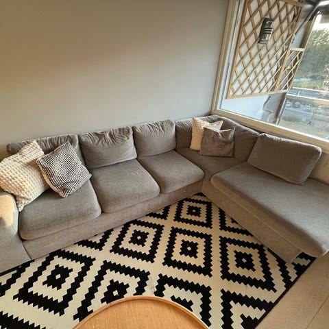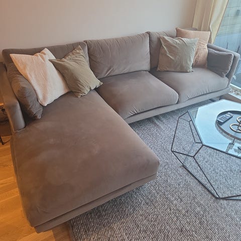 Denne sofaen trenger nytt hjem, hel og pen uten flekker. Trekkene har glidelås og kan vaskes. Usikker på hvor den er kjøpt. Størrelsen er 280x230 cm. Ikke glatt stoff, men et mer robust og slitesterkt.