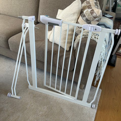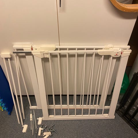Lite brukt sikkerhetsgrind i hvit metallutførelse. Grindens konstruksjon består av vertikale spiler og en ramme som festes med trykkfester i døråpning eller mellom vegger, uten behov for boring. Egnet som barnegrind eller husdyrgrind for å sperre av trapper eller romåpninger. Passer til innendørs bruk.