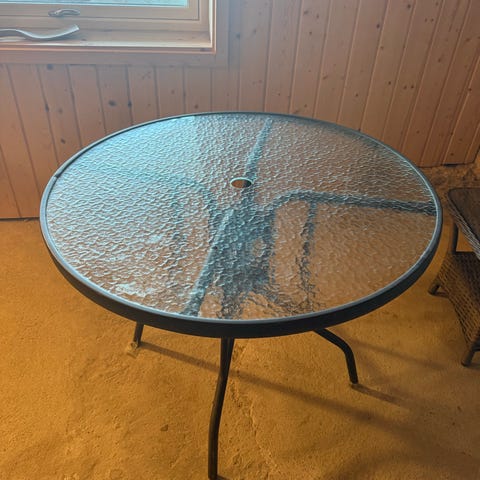 Utebord med glassplate. Ca 90cm diameter og 70 cm høyde