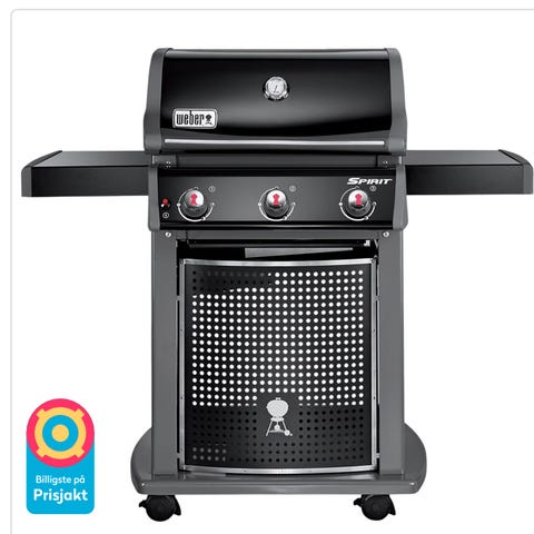 Weber gassgrill i svart utførelse. Grillen har lokk med innebygd termometer, grillrist i metall og to hovedbrennere med reguleringsknapper på siden. Den har sidebord på begge sider for avlastning under grilling, samt underskap med dører for oppbevaring av utstyr. Grillen står på hjul for enkel flytting på terrasse eller uteplass.