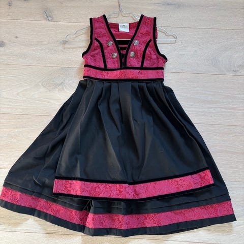 Nydelig festdrakt med rød overdel og svart skjørt.