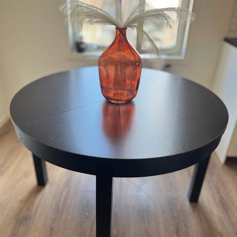 Bordet er solid og praktisk med uttrekksfunksjon. Det har noen små riper, men disse er lite synlige og kan enkelt skjules med svart tusj.