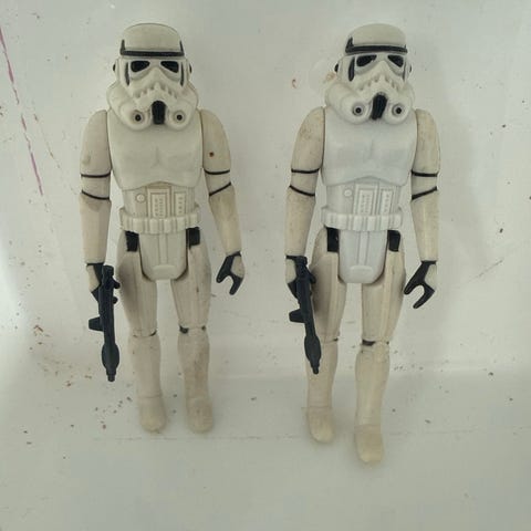 Star Wars Scout Trooper actionfigurer i hvit og svart. Figurenes design er basert på speidertroppene fra Star Wars-universet, med hjelm, brystplate og detaljerte rustningselementer. Egnet som samleobjekt eller lekefigur for barn og voksne som liker Star Wars og actionfigurer.