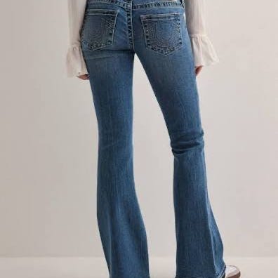 True Religion jeans for dame i størrelse S med livvidde W28. Buksen er laget i blå denim med vasket effekt. Klassisk 5-lommersmodell med beltehemper, knapp og glidelåslukking foran. Baklommer med karakteristisk True Religion-søm og knappelukking. Passer til hverdagsbruk og kan kombineres med ulike topper og sko for både uformelle og mer oppkledde antrekk.
