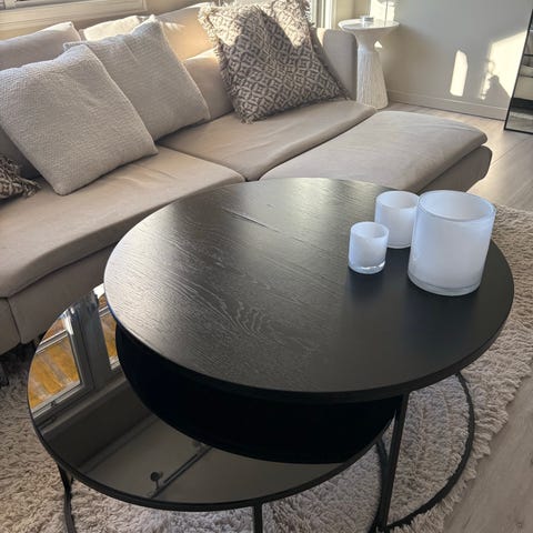 Elegant og tidløst sofabord sett ,bestående av to runde bord i serien Årum. Kjøpt hos Hugna i 2024. Bordene er i eikefiner i sort finish m/slanke metallben og kan skyves delvis eller helt under hverandre. Både praktisk og dekorativt. Bordet har ingen hakk,men noen overfladiske riper.