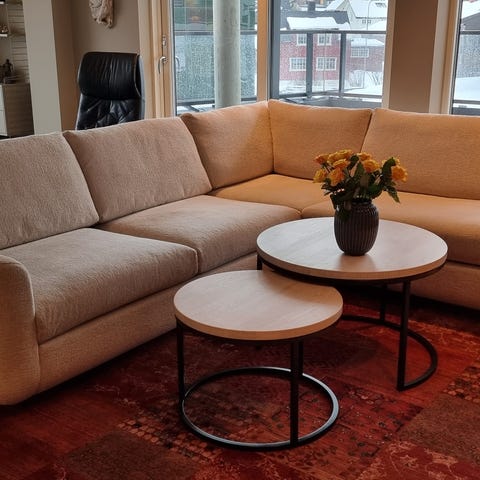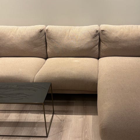 Sofa i tekstil. Ryggtrekk kan vaskes i maskin. Trekket er helt. Sete nr 2 fra venstre har en fjær som er hevet, kan kanskje rettes ut? Bortsett fra det er sofaen fin.