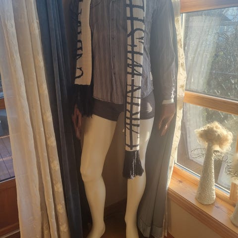 Mannlig torso utstillingsdukke i hvit farge. Dukken viser overkropp fra hodefestet og ned til knær, med armer inkludert. Egnet for visning av herreklær som jakker, skjorter, gensere, overdeler og undertøy i butikk eller utstillingsvindu. Laget i hard plastmateriale som står stødig på flat overflate.