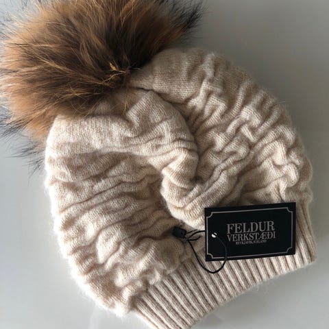 Selger en eksklusiv og ubrukt lue fra Feldur Verkstæði (Island). Luen er i myk ull og har stor, ekte pelsdusk.