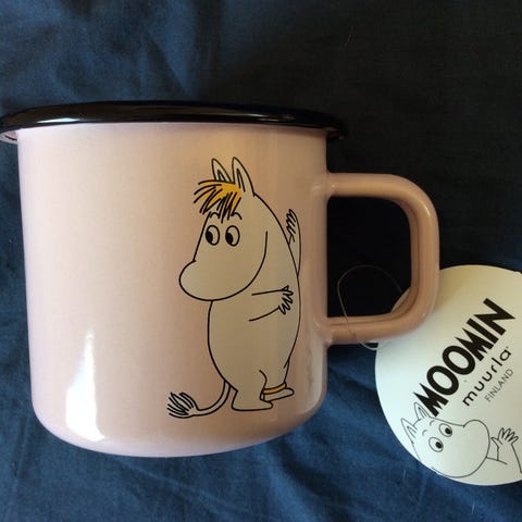 Mummi emaljekopp i hvit farge med Mummi-motiv og blomsterdekor langs kanten. Koppen har hank og mørk kant øverst. Egner seg til varm og kald drikke, og kan brukes både inne og ute, for eksempel på tur eller hjemme. Laget i emalje som gir en lett og robust kopp.