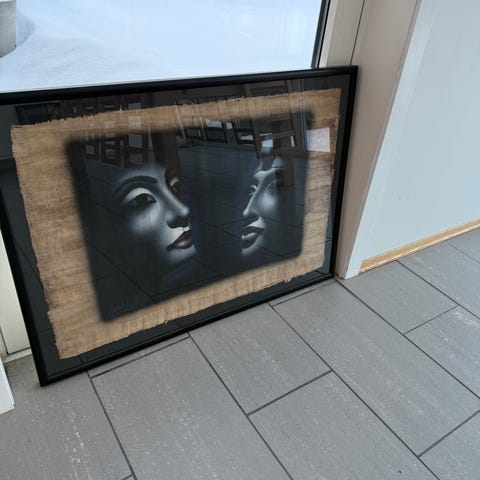Abstrakt portrettmaleri av en kvinnes ansikt i nærbilde. Bildet er utført i en ekspressiv, lagdelt stil med brede penselstrøk og tydelige fargefelter. Fargepaletten består av blant annet beige, rosa, brun, blå og grå toner. Motivet viser lukkede øyne og avslappet ansiktsuttrykk. Maleriet er innrammet med en smal, mørk ramme og egner seg som veggdekor i stue, soverom eller gang. Kjøpte det for 3500
