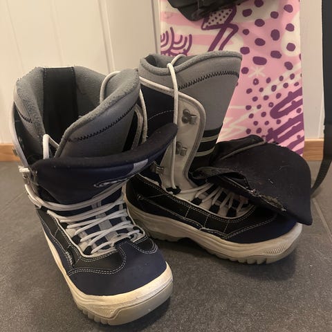 Nitro Flora TLS snowboardstøvler for dame i størrelse 38 (US 7, UK 5, Mondo 24,5). Modellen har TLS hurtigsnøresystem med separate snorer for øvre og nedre del av støvelen. Overdeler er grå og svarte med turkise detaljer, og turkis på innsiden. Støvlene er egnet til bruk i alpinanlegg og frikjøring på snowboard.