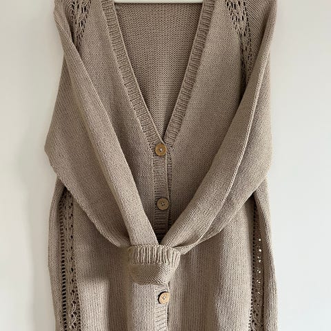 Langermet, med vertikale fletter som går nedover plagget, kombinert med en bred ribbestrikket kant nederst.