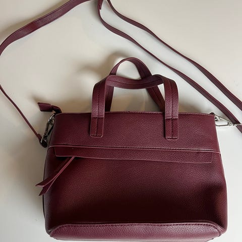 En liten Burgunder rød skulder veske. Str 17×13. Jeg får fint min mobil som er 16×7 cm. (Men jeg bruker deksel m lommebok, og den ruver, så er ikke plass til den da. Derfor salg.) Det er to lommer, den ene m kortholdere i. Kjempefin veske m plass til der mest nødvendige. Er aldri brukt. Merke Don Donna.