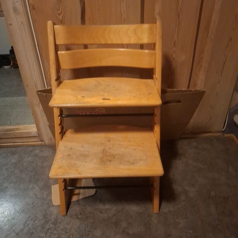 Tripp trapp stol , godt brukt, men mye bruk igjen. Med en male strøk blir den nesten som ny om man ønsker penere utseende.