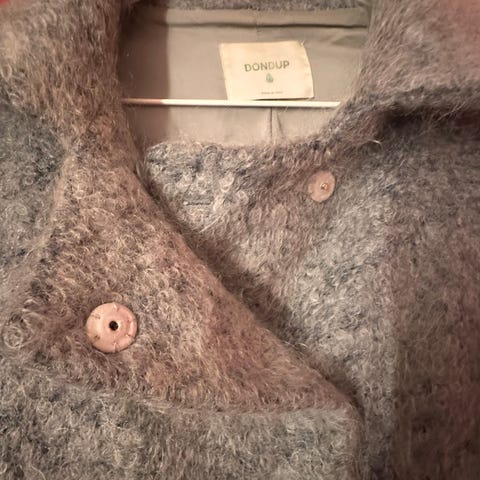 Kåpen er grå, lang,foret inne i kåpen.str 38,40.den har ikke vært i rom som er røykt i eller husdyr.
