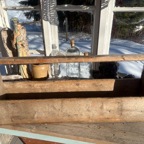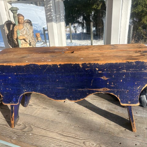 Trebenk i gråmalt treverk. Benken har enkel, tradisjonell utførelse med fire ben og tverrstøtte for ekstra stabilitet. Bredde 53 cm dybde 21 cm høyde 29 cmOverflaten viser bruksspor og slitasje i malingen, og det er synlig skade/sprekk i treverket på langsiden. Egner seg som liten sittebenk, avlastningsbenk eller dekorativt møbel i for eksempel gang, stue eller uteplass under tak, avhengig av behov og tilstandsvurdering fra kjøper.