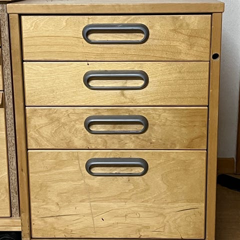 Godt brukt kommode med noen skader. Oppi ene skuffen har det lekket hårspray, dette kan sikkert skrapes bort. Gies bor slik den er, fin oppbevaringsplass i en bod, garasje eller kjeller.