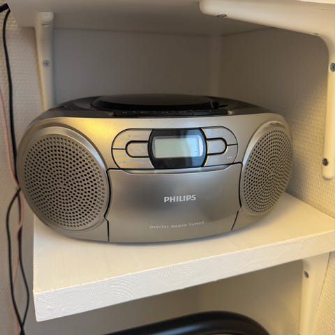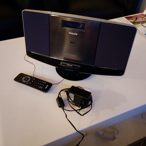 Philips CD-spiller med tilhørende høyttalere. Anlegget består av hovedenhet med CD-spiller og radiofunksjon, samt to separate høyttalere som kobles til på baksiden. På baksiden finnes tilkoblinger for høyttalere og antenne.