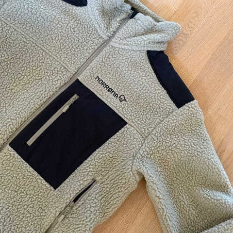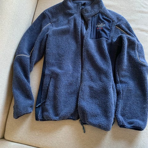 Fleecen er brukt og det kan ses litt på kanter og slikt, men ellers er den hel og pen.