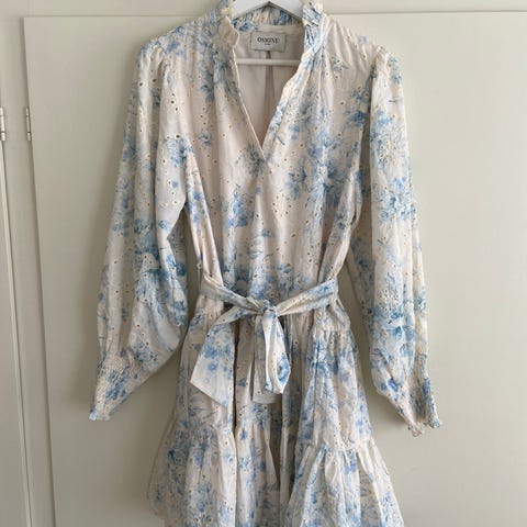 Floyd Alina sommerkjole for dame i størrelse M. Kjolen er beige med blomstermønster og er laget i polyester. Modellen har lange ermer, knappelukking i front og markert midje med belte. Nederdelen har lett utsvinget fasong. Egner seg godt som sommerkjole til hverdagsbruk og enkle anledninger.