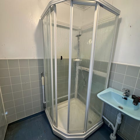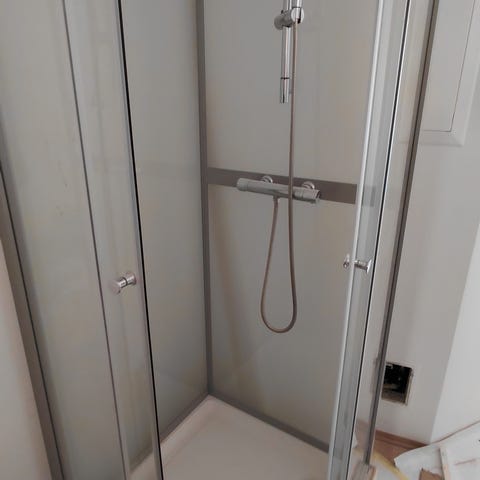 Er demontert og blir lett vasket. Vil fortsatt være litt støv etc. ikke brukt i våres eie. Pent, men ett lite merke på hvite skinne i midten på høyre sidevegg(der blandebatteriet er)