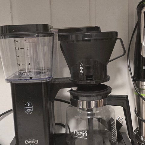 Kaffetrakteren har separat vannbeholder med nivåmerking og filterholder over glasskannen. Glasskannen har håndtak i plast og lokk.