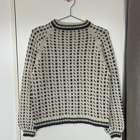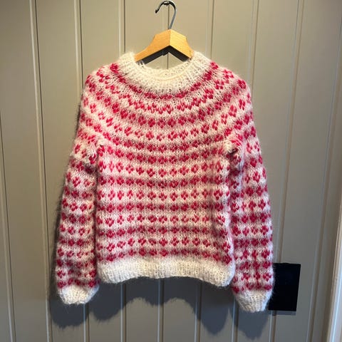 Islenderen er rosa og hvit,strikket i baby merino,som ikke klør. Genseren er ubrukt da den ble for liten til mottaker.Kan sende på kjøpers regning.