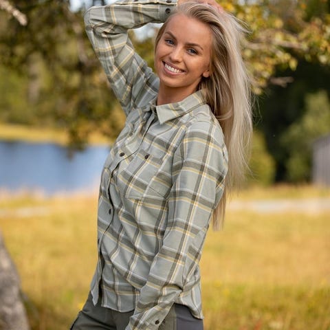 Myk bomullsflannell. Trykknapper, brystlomme, lett figurfin damemodell. Buet nederkant, litt lengre bak.