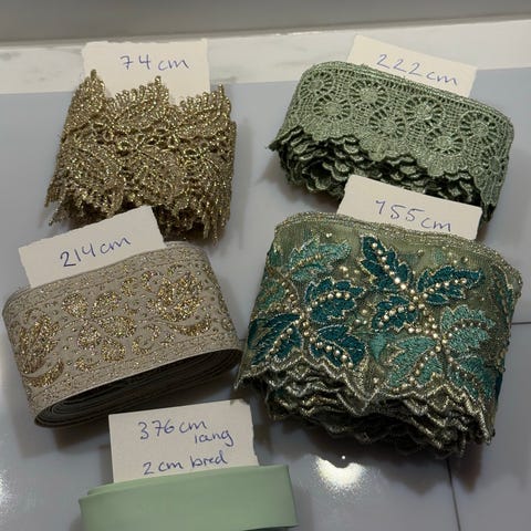 Pyntebånd/kantbånd/skråbånd/Dekorbånd i ulike mønstre og bredder i grønn- og gulltoner.