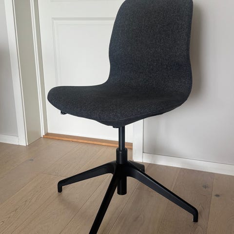 IKEA-merke: LÅNGFJÄLL. Blågrått trekk. Regulerbar høyde ca 12 cm. (80 cm er laveste rygghøyde).Svingbar 360 gr.