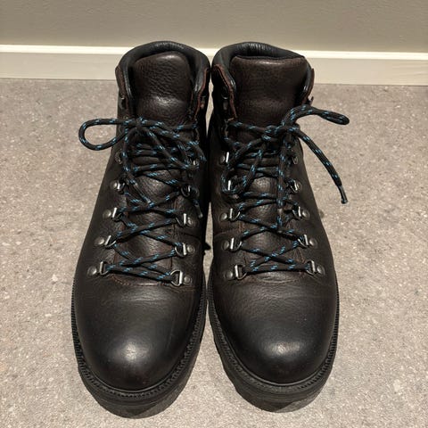 Nesten ubrukte. Store i str, jeg bruker vanligvis 42-43. Passer til og med ekstra ullsokk. Følger med skopose og svarte lisser. Nypris 2000,-