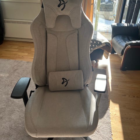 Anda Seat gamingstol i svart stofftrekk. Stolen har høy rygg med integrert hodestøtte og avtagbar korsryggpute med Anda Seat-logo. Armlenene er justerbare, og stolen står på fotkryss med hjul for enkel forflytning. Egnet som kontor- eller gamingstol ved skrivebord. Stått under trappen og derfor litt støvete, rengjøres før salg.