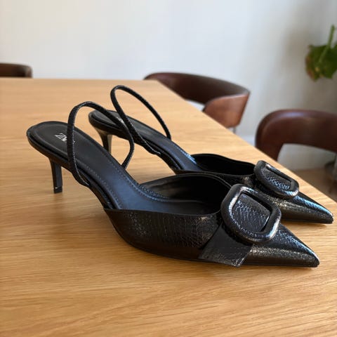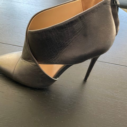 Zara hæler i størrelse 38. Skoene er i brun farge med dekorative sømmer i kontrastfarge og lav hæl. Modellen er ankelhøy med glidelås på siden for enkel av- og påtaking. Passer til bruk både til hverdags og mer pyntede anledninger.