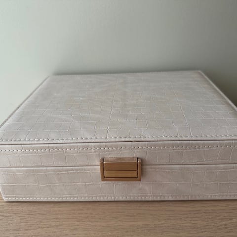 Selger et stilrent og praktisk smykkeskrin med lokk. Perfekt for organisering av smykker, håraccessoirer og småting – både hjemme og på reise.