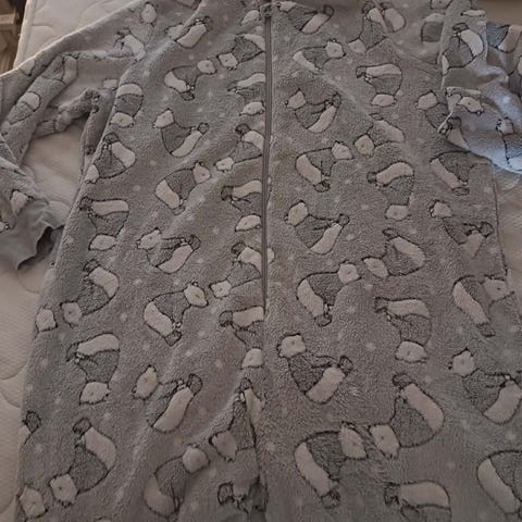 Rød onepiece velur (75% bomull), i størrelse 42/44. Den har lang glidelås foran, hette og lange ermer med mansjetter. Foran er det to påsydde lommer. Passer som koseplagg eller loungewear. Ingen synlige bruksmerker (brukt få ganger)