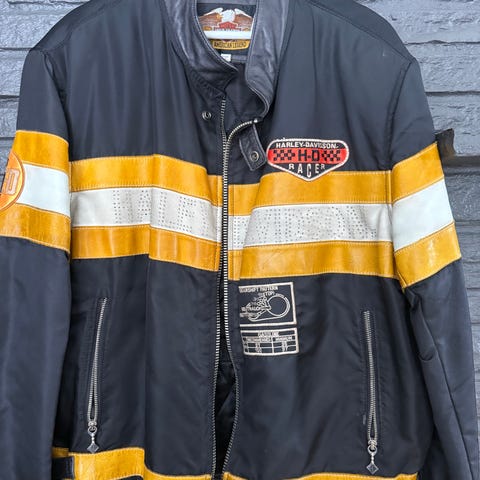 Harley-Davidson FXRG herre kjørejakke og kjørebukser i skinn, størrelse XL. Jakken er svart og laget i kraftig skinn med flere glidelåslommer foran. Den har detaljerte sømmer og polstrede partier på skuldre, ermer og knær på buksene. Justeringsmuligheter ved krage og ermer.