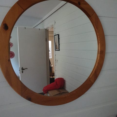 Vakkert speil med solid ramme i mørkt beiset eik kr 600,-