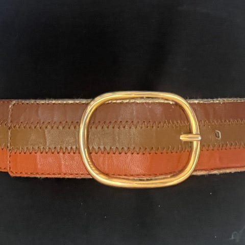 Selger et nydelig vintage belte fra Yves Saint Laurent i skinn. Det har dekorative sømmer og stor rund spenne også i skinn. Beltet er 92cm langt totalt, 77cm til det første/ytterste hullet og 70cm til det siste/innerste hullet. Kan passe fint til XS/S/M avhengig av hvordan man ønsker å bruke det.