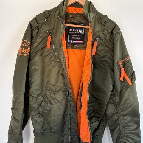 Alpha Industries MA-1 bomberjakke for herre i størrelse XL. Jakken er laget i grønn nylon med oransje fôr. Modellen har ribbestrikket krage, mansjetter og linning, samt glidelås i front. På armen er det lomme med glidelås og påsydd «Remove Before Flight»-bånd, samt påsydd NASA-patch på skulderen. Klassisk flygerjakke med flere utvendige og innvendige lommer. Passer som ytterjakke i overgangssesong og mildere vintervær, avhengig av temperatur og egen komfort.