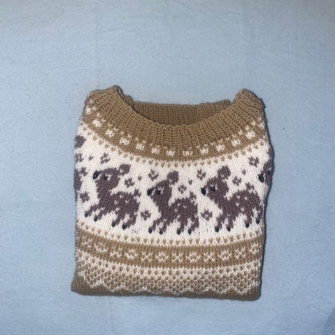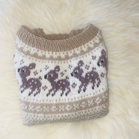 Ny hjemmestrikket Bambi/Mariusgenser m rådyr,1-2 år(86/92)100% tm ull