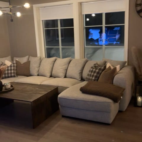 Trademax hjørnesofa i tekstil i beige fargetoner. Sofaen har vinkelutforming med flere sitteplasser og løse rygg- og pynteputer. Trebenk eller bord på bildet følger ikke nødvendigvis med. Designet er tilskrevet Peter Opsvik. Passer som hovedsofa i stue eller TV-stue, og gir god sitteplass til flere personer.